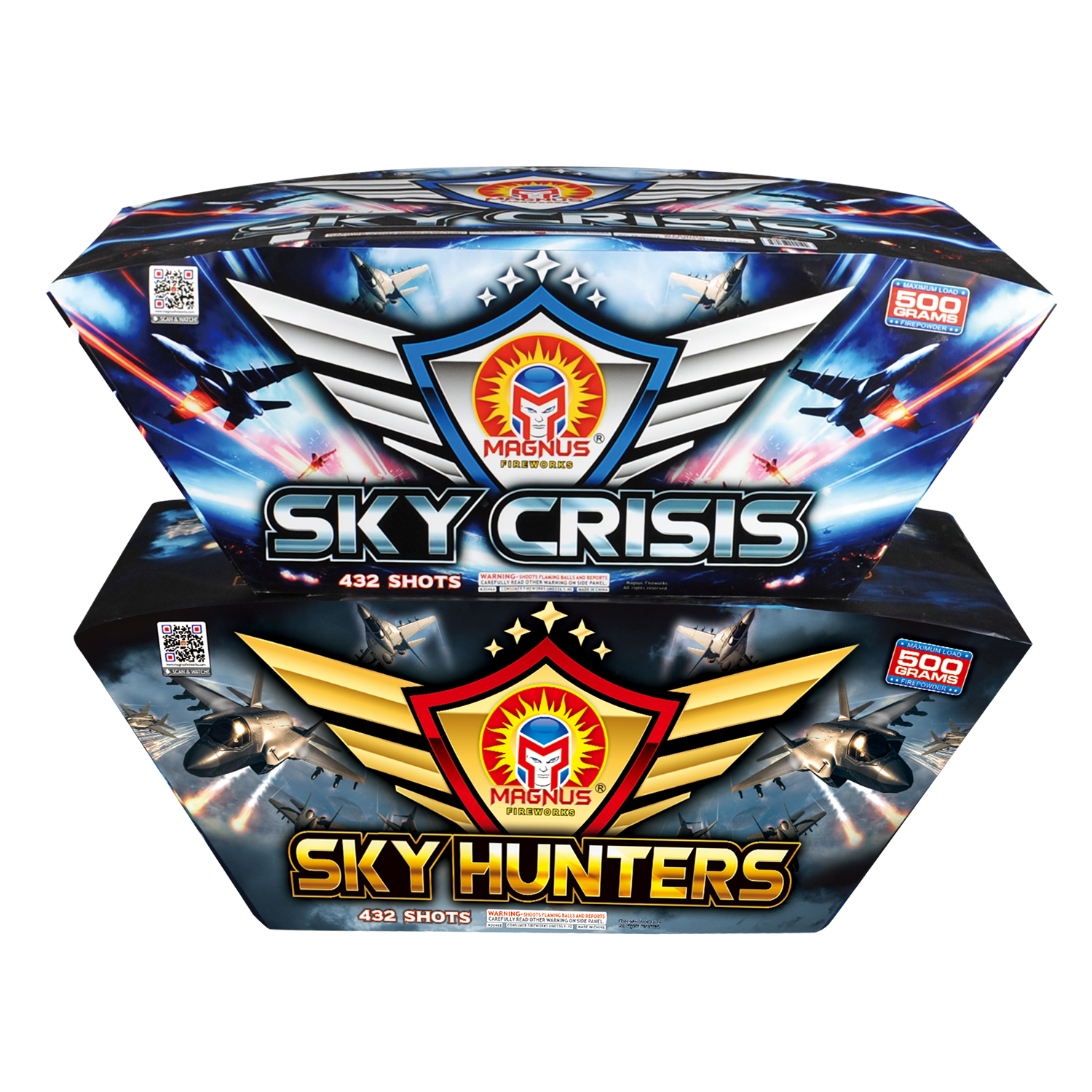 Sky Crisis: Scramble the fighters and prepare for a Sky Crisis! This awesome zipper cake has 432 shots, including a rapid-fire fan of red, green, yellow, blue, and purple stars! A large spread of 7 willows then fills the air with sky-blue and fiery red strobes. Declare victory with a 5-shot finale of fan-shaped gold willows with colorful pearls!